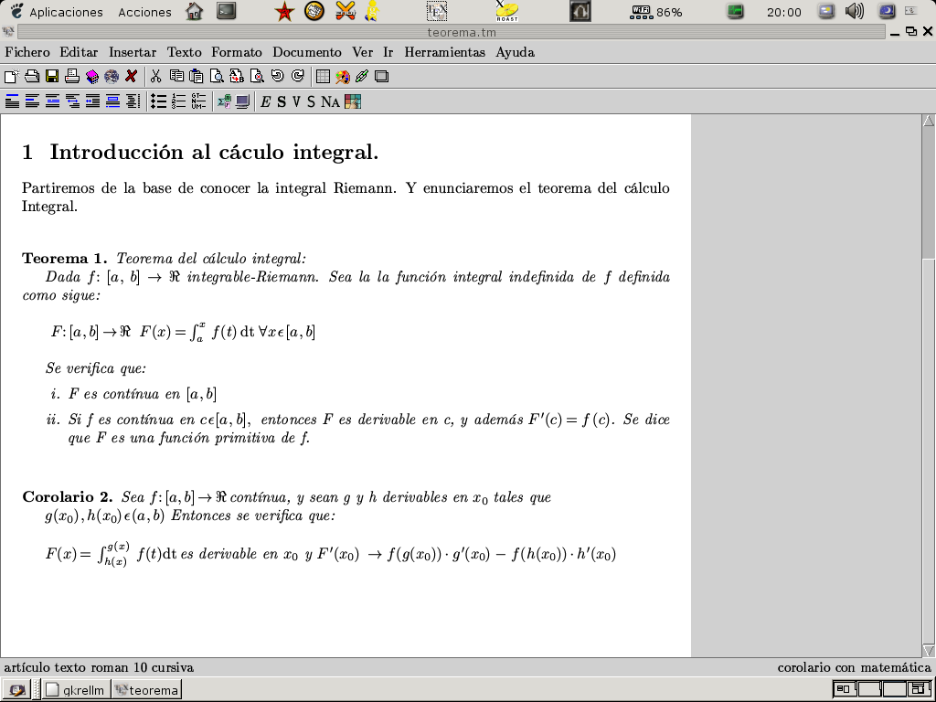 Crearemos el "Teorema". Hacemos clic en el icono "Teorema", y escribimos el teorema de fundamental del cálculo integral (por ejemplo :) Hay que tener en cuenta cuando debemos entrar y salir del modo "matemático" de TeXmacs. Es muy sencillo.