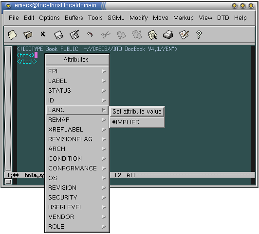Como nuestro primer ejemplo estará escrito en castellano, es necesario indicar el idioma a que vamos a usar, para ello necesitamos editar uno de los atributos de la marquilla <book>; através de menúes esto se puede hacer con Markup->Insert Attribute (Botón Derecho). A continuación se presentarán los diferentes atributos de dicha marquilla, es necesario entonces seleccionar LANG->Set Attribute, a continuación en el buffer aparecerá Value for LANG(CDATA): , por lo que habrá que escribir es. Tendremos entonces que nuestro editor lucirá de la siguiente forma