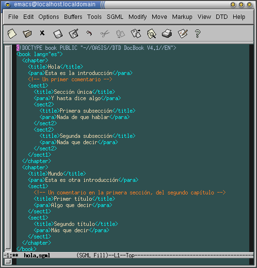 Para comenzar a escribir un documento necesitará abrir una sesión de emacs, para ello desde la línea de comandos del shell, ejecute emacs hola.sgml&, en mi computador esto luce de la siguiente forma:
