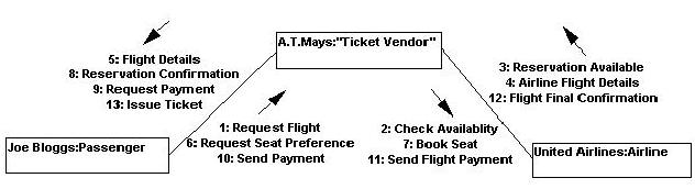 El Diagrama de Colaboración presenta una alternativa al diagrama de secuencia para modelar interacciones entre objetos en el sistema. Mientras que el diagrama de secuencia se centra en la secuencia cronológica del escenario que estamos modelando, el diagrama de colaboración se centra en estudiar todos los efectos de un objeto dado durante un escenario. Los objetos se conectan por medio de enlaces, cada enlace representa una instancia de una asociación entre las clases implicadas. El enlace muestra los mensajes enviados entre los objetos, el tipo de mensaje (sincrónico, asincrónico, simple, blanking, y 'time-out'), y la visibilidad de un objeto con respecto a los otros.