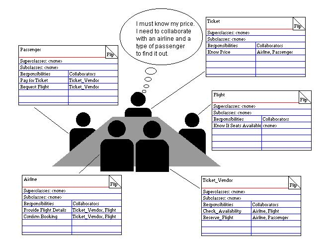 Cada clase se representa en una tarjeta índice (index card), y los diseñadores establecen los papeles (roles) de las clases en el sistema para definir su trabajo, y con qué otras necesitan colaborar para completar sus responsabilidades. Esta información se pasa directamente a un diagrama de clase; las responsabilidades coinciden con los métodos de clase, las colaboraciones se traducen en asociaciones entre clases.