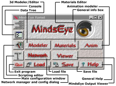 Дизайн - это самая интерестная часть MindsEye. Все части, начиная с наименьших элементов и кончая такими как modeler являются модульными. В центре программы находится то, что мы называем ядро MindsEye. Это часть программы, которая сама по себе не способна выполнять графическую работу. Вместо этого она управляет всеми модулями и plugins. Её можно назвать большой планировщик ресурсами (big resource manager). Это также место, где содержится вся структура данных. В MindsEye существует четкое различие между модулем и plugin. Модуль - это некий динамический код, о котором "знает" ядро. Модуль загружается и выгружается ядром. Например, сетевой модуль (network module) это мост, который соединяет несколько ядер. Сетевой модуль можно рассматривать как модуль, который замещает какой нибудь из других модулей. В настоящее время мы определили набор основных модулей:
