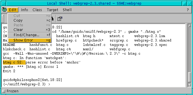 Kabuk penceresi genel olarak derleyici çalışırken kullanılır. Kaynak kodundaki hatayı atlamak için kabuktaki hata mesajına önem vermeli ve sonra Edit->Show Error u seçmelisiniz. Bu sizi kaynak düzenleyicisinde hatanın oluştuğu satıra götürür. Aynı zamanda kabuk penceresi çok basittir. Ayrıca problemlerin tanımları için kabuk pencereme bakın.