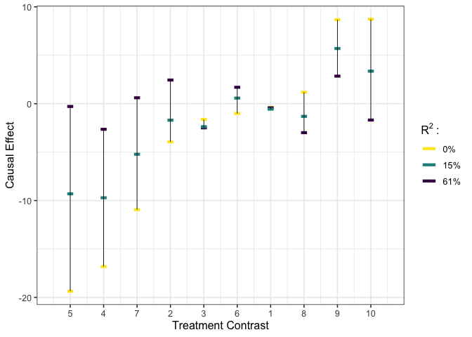 We explore the ignorance regions for each treatment as well as causal estimates with multiple contrast criteria (MCCs) using the method described in Zheng, D’Amour and Franks (2021).