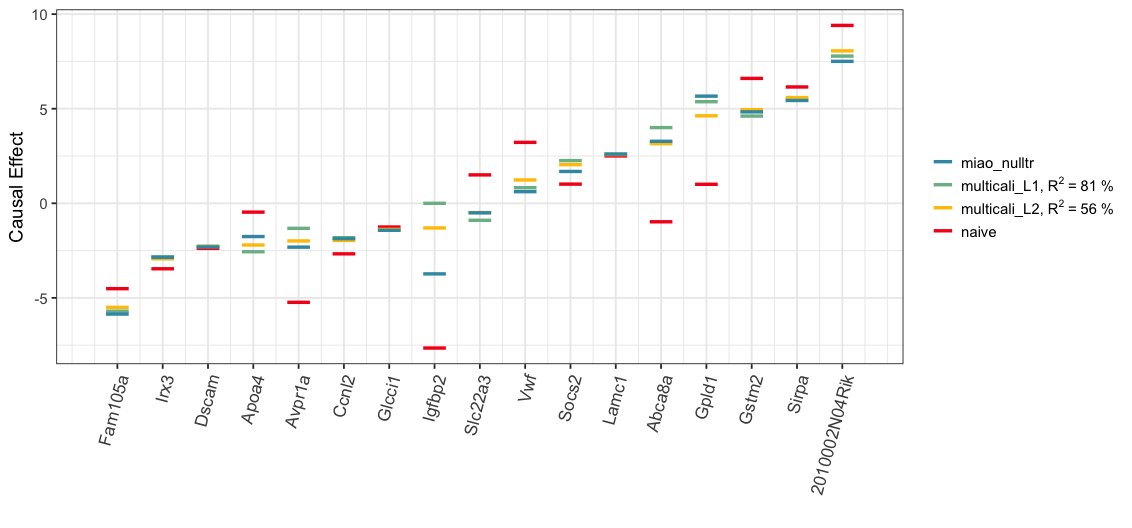 Below, we visualize the analysis results. The Spearman’s rank correlation between the estimated treatment effects of Miao et al. (2020) with the null treatment assumption (“miao_nulltr”) and ones by our MCC procedure with the L1 (“multicali_L1”) or L2 minimization (“multicali_L2”) is 0.90 or 0.93 respectively. In the plot below, the blue, green and yellow bars are closely grouped together for majority of treatments.