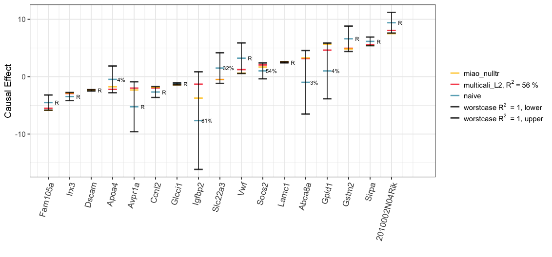 For further illustration, we compare our approach to a recent analysis of a mouse obesity dataset (Wang et al. (2006)), conducted by Miao et al. (2020), where the effect of gene expressions on the body weight of F2 mice is of interest. The data are collected from 287 mice, including the body weight, 37 gene expressions, and 5 single nucleotide polymorphisms. Among these 37 genes, 17 are likely to affect mouse weight (Lin et al. (2015)). In our example here, we focus on estimating the treatment effects of these 17 genes, and consider the comparison to the null treatments approach from Miao et al. (2020), which assumes that at least half of the confounded treatments have no causal effect on the outcome.