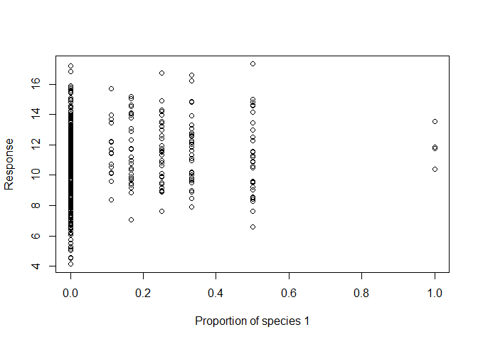 plot(sim3$p1, sim3$response, xlab = "Proportion of species 1", ylab = "Response")