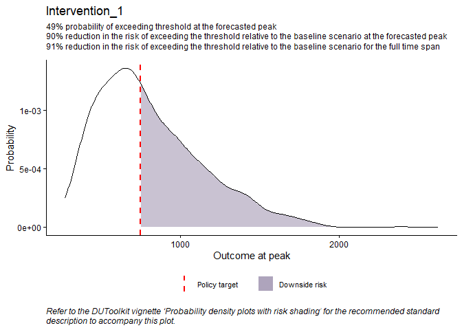 The DUToolkit package provides a suite of tools and visualization for the characterization, estimation, and communication of parameter uncertainty and decision risk. The package is designed to evaluate the impact of policy alternatives on outcomes compared to baseline (i.e., counterfactual analysis), leveraging model outputs from uncertainty analysis. See Wiggins et al. (2025) for a full description of the underlying methods.
