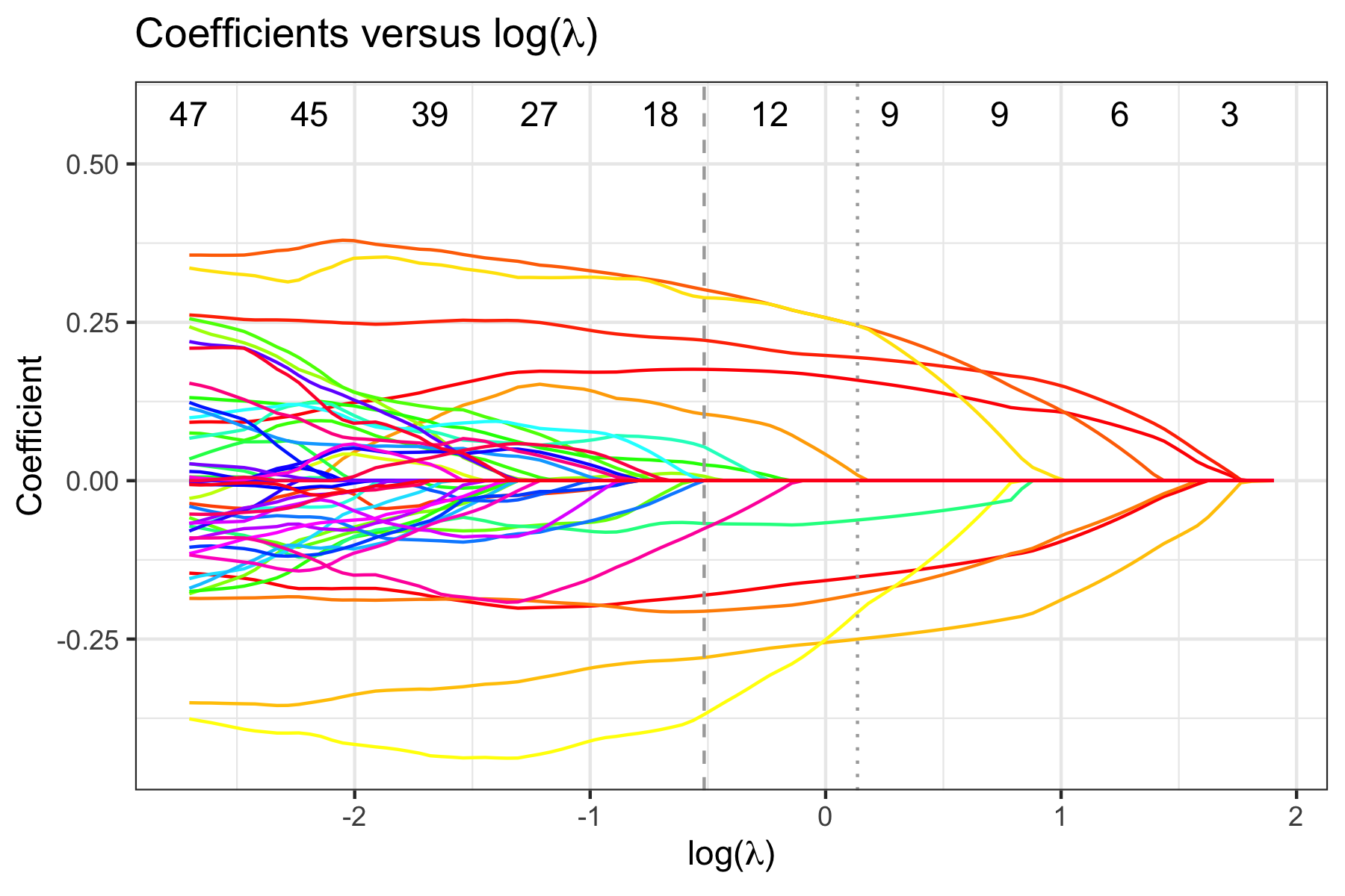 dat.fg <- FLORAL(dat.cox$xcount,survival::Surv(dat.cox$t,dat.cox$d,type="mstate"),family="finegray",ncv=10,progress=FALSE,step2=FALSE) fit.fg