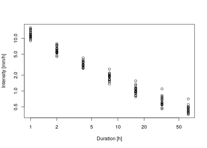 plot(ann.max$ds,ann.max$xdat,log='xy',xlab = 'Duration [h]',ylab='Intensity [mm/h]')