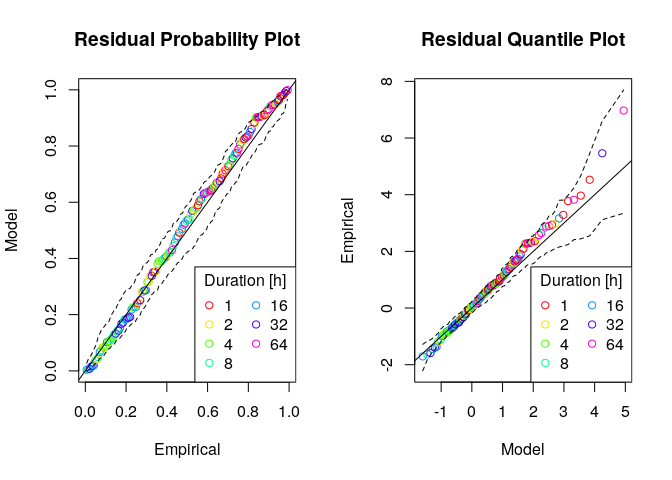 This Example depicts the different features that can be used to model the IDF curves, see Fauer et. al (2021, https://doi.org/10.5194/hess-25-6479-2021). Here we assume, that the block maxima of each duration can be modeled with the GEV distribution ():