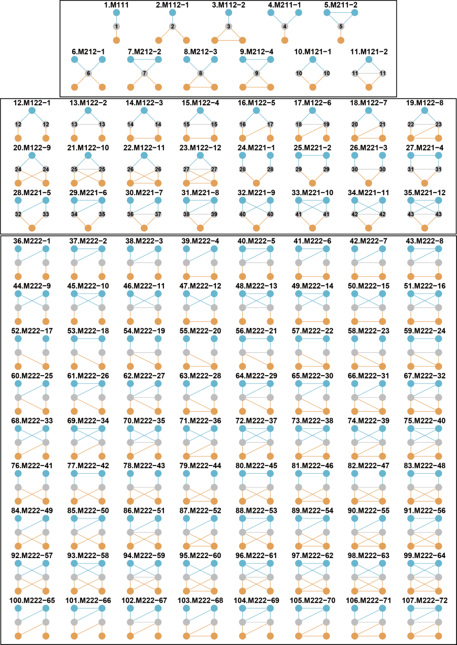 Fig. 4. The 107 forms of interconnection motifs with intra-guild