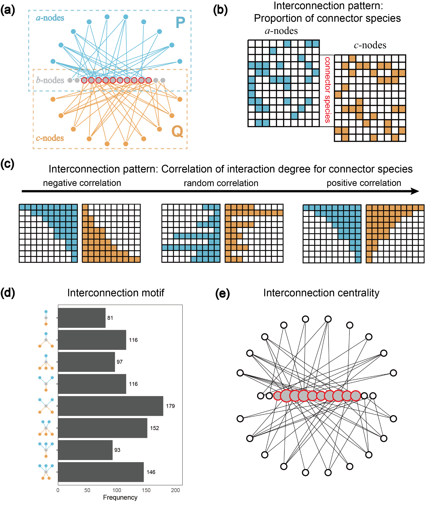 Here, we define 48 forms of interconnection motifs (Fig. 2). An interconnection motif must comprise three sets of connected nodes: the connector nodes (belonging to the b-nodes), the nodes in one subnetwork (belonging to the a-nodes in the P subnetwork), and the nodes in the other subnetwork (belonging to the c-nodes in the Q subnetwork). We further restrict each motif to contain no more than six nodes and to have no intra-guild interactions.