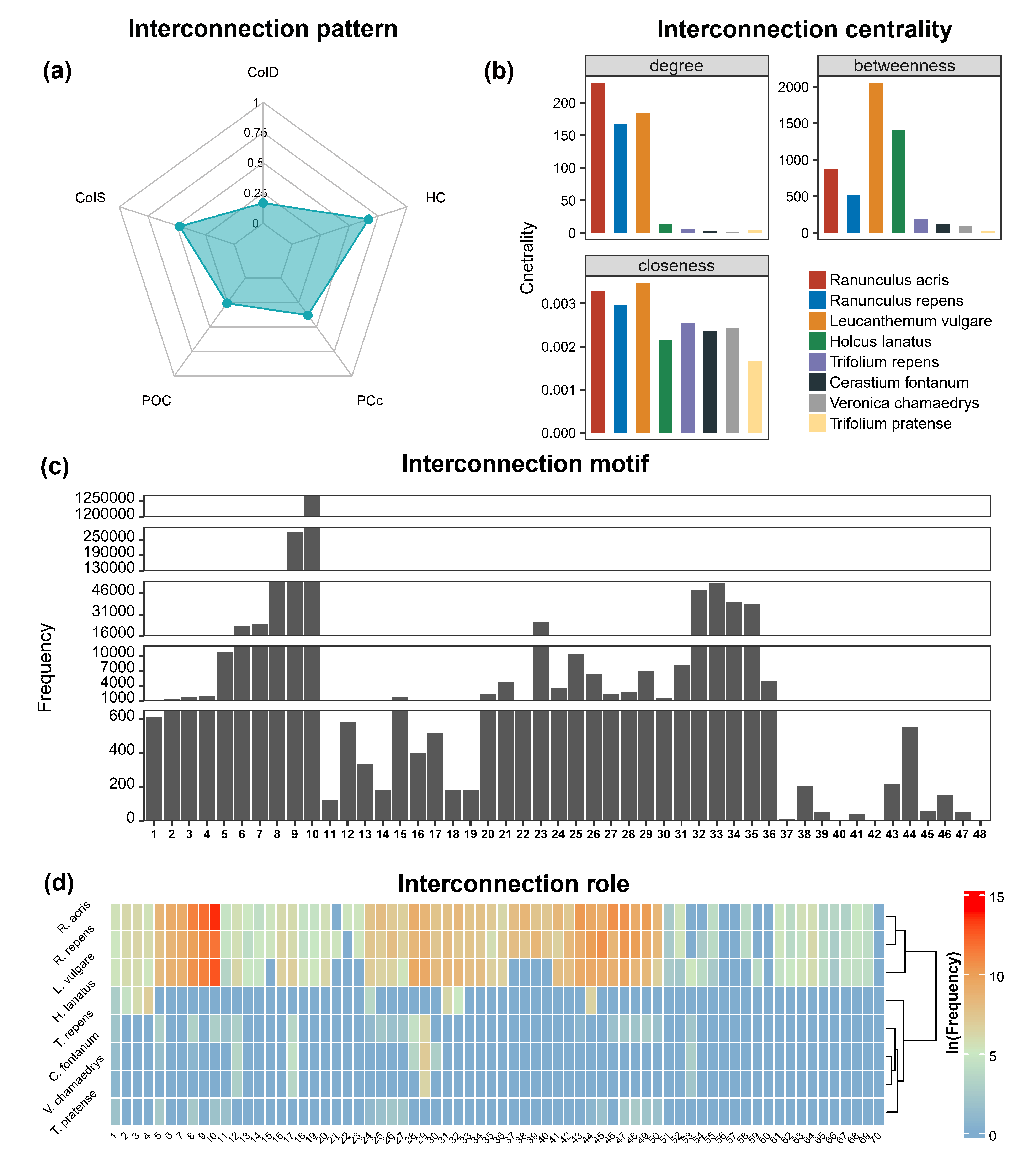 interconnection motifs. (d) The frequencies (ln-transformed) of 70 roles