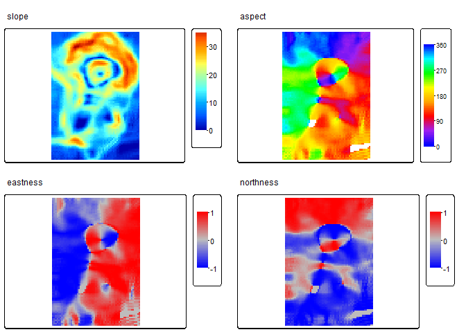 <- SlpAsp(r = r, w = c(5,5), unit = "degrees", method = "queen", metrics = c("slope", "aspect", "eastness", "northness"), na.rm=TRUE) slp_asp