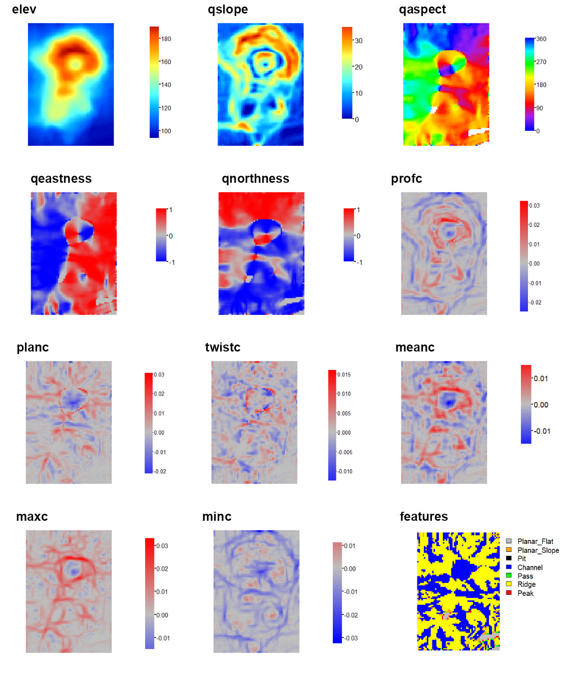 <- Qfit(r, w = c(5,5), unit = "degrees", metrics = c("elev", "qslope", "qaspect", "qeastness", "qnorthness", "profc", "planc", "twistc", "meanc", "maxc", "minc", "features"), na.rm = TRUE) qmetrics