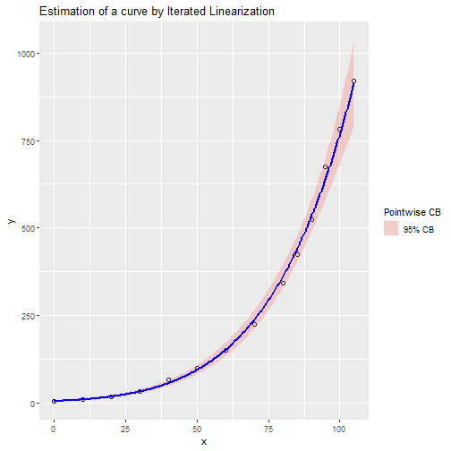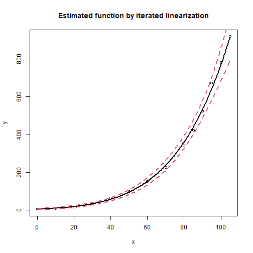 plot(st1, signif.level = 0.05, interval = "conf", main = "Estimated function by iterated linearization")