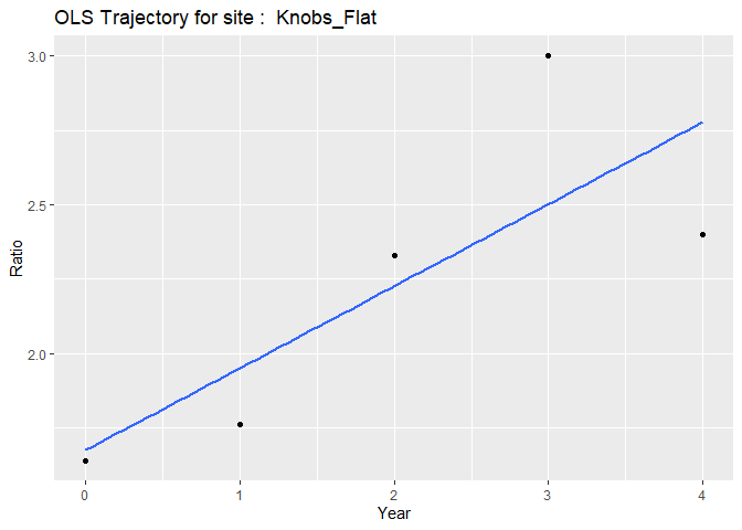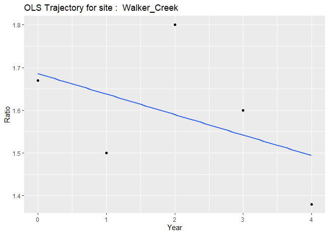 This serves as an exemplary demonstration of using OLStrajr. It features an analysis of data representing the yearly ratio of male to female robins, as documented in Birds: incomplete counts—five-minute bird counts Version 1.0. This data, collected at Walker Creek and Knobs Flat from August 2005 to August 2009, provides a compelling case study