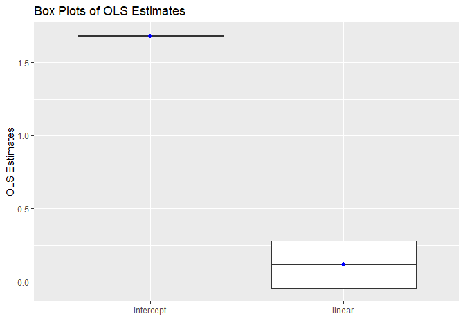 Box plots provide a summary of the distribution of intercepts and slopes across subjects. They allow you to visualize the spread and skewness of the data. Any outliers are clearly highlighted in these plots. In the OLStraj box plots, the mean value is represented by a blue dot. Additionally, each outlier is labeled with the corresponding subject identifier, providing a straightforward way to identify subjects whose data deviate significantly from the rest of the group.