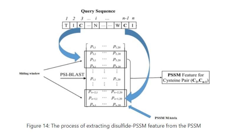 The length of this feature vector is 320. The first 20 numbers of this feature vector are the mean of 20 columns in PSSM, and the next values for each column are the mean squares of the difference between the elements of row i and i + lag in this column. Because the lag value varies between 1 and 15, the final feature vector will have a length of 320. Figure 5: and following equation shows the process of this function and the corresponding mathematical equation, respectively.