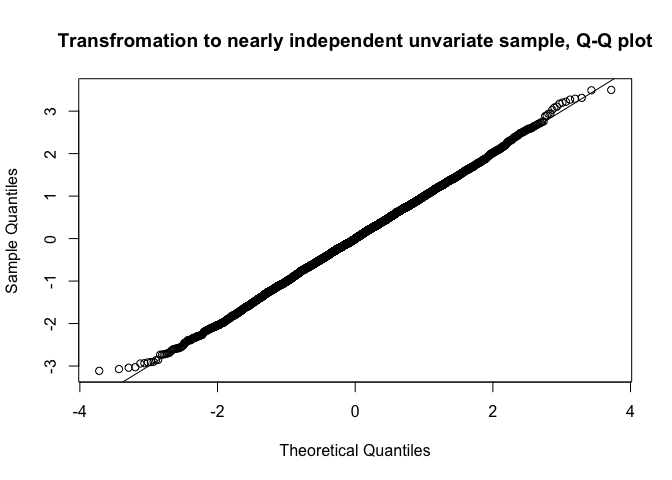 qqnorm(df$x.new, main = "Transfromation to nearly independent unvariate sample, Q-Q plot"); abline(0, 1)