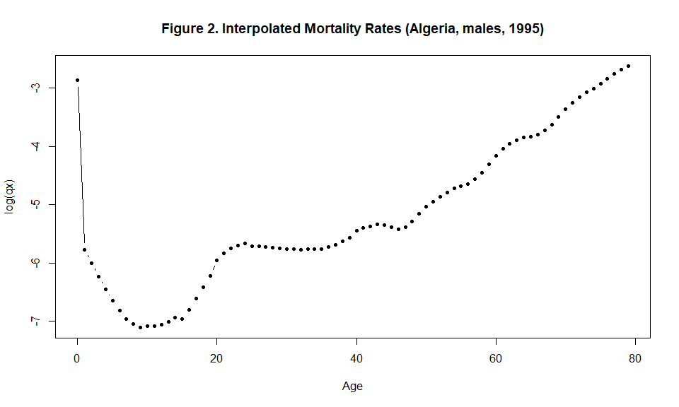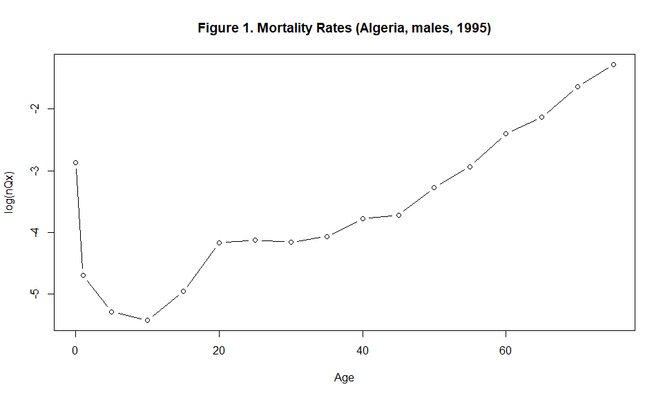 plot(x=c(0,1, seq(5, (length(Ax)-2)*5, by=5)), y=log(Ax), type="b", xlab="Age", ylab="log(nQx)", main="Figure 1. Mortality Rates (Algeria, males, 1995)", cex=1 )