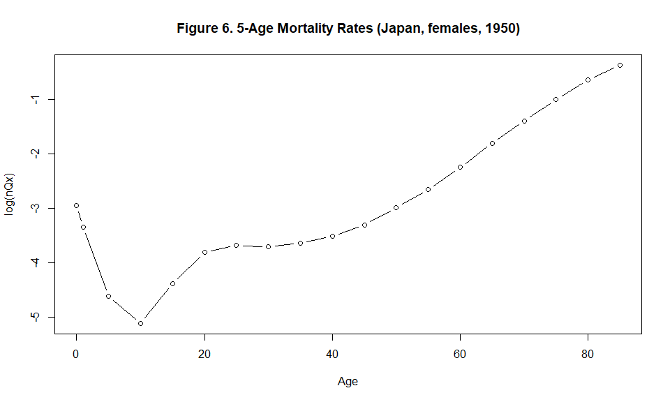plot(x=c(0,1, seq(5, (length(Qx)-2)*5, by=5)), y=log(Qx), type="b", xlab="Age", ylab="log(nQx)", main="Figure 6. 5-Age Mortality Rates (Japan, females, 1950)", cex=1 )