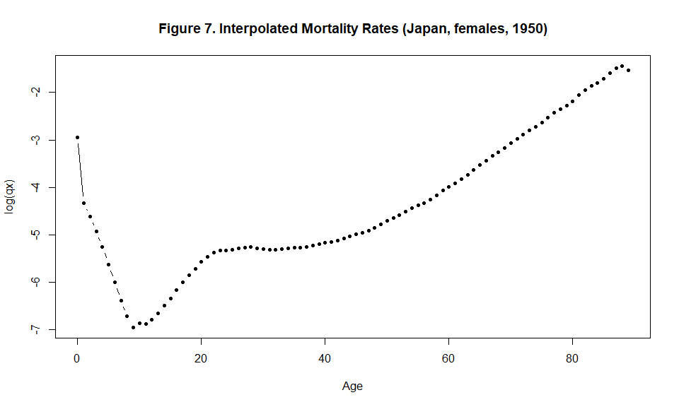 plot(x=c(0:(5*(m-1)-1)), y=log(qx$qx), type="b", pch=19, xlab="Age", ylab="log(qx)", main="Figure 7. Interpolated Mortality Rates (Japan, females, 1950)", cex=0.75)