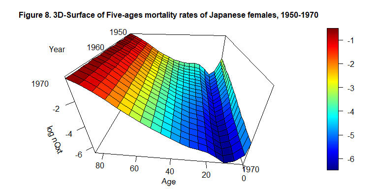 persp3D(x=c(0,1, seq(5,85, by=5)), y=c(1950:1970), z=log(LT_4_2), phi = 30, theta = - 175, border = "black", facets = TRUE, inttype = 1, add = F, ticktype = "detailed", expand = .6, scale=1.5, r=.6, box=TRUE, xlab="Age", ylab=NULL, zlab="log nQxt", plot=F, axes=T, main="Figure 8. 3D-Surface of Five-ages mortality rates of Japanese females, 1950-1970", cex.main=1 )