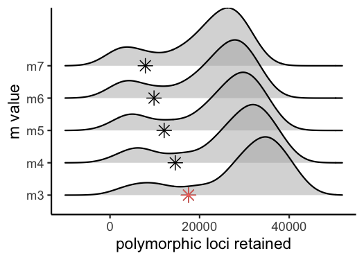 #> Visualize how different values of m affect number of polymorphic loci retained.