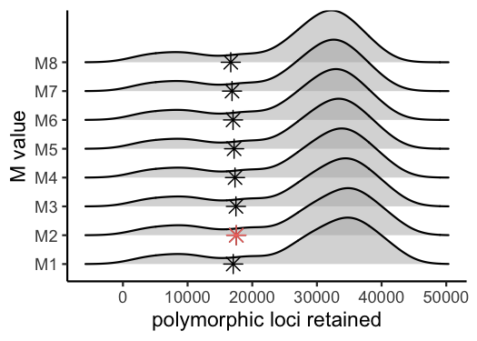 #> Visualize how different values of M affect number of polymorphic loci retained.