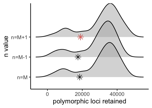 #> while the asterisk denotes the total number of loci retained at an 80% completeness cutoff. The optimal value is denoted by red color.
