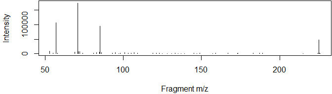 msdataplot(int~fragmz, type="h", data=., ylab="Intensity", xlab="Fragment m/z")