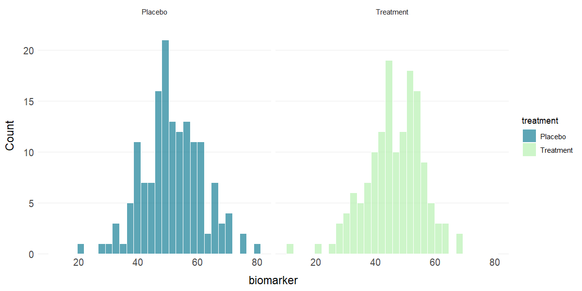 plot_hist(clinical_df, x = "biomarker", facet = "treatment")