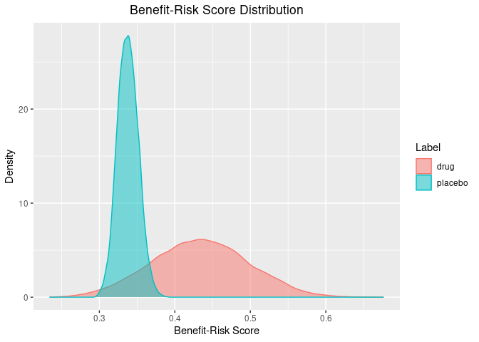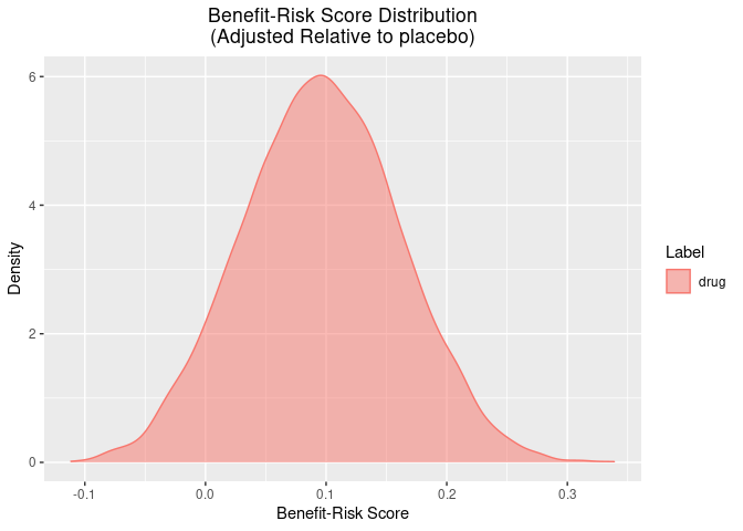 We can also calculate the posterior probability of certain scores. For instance, we can calculate the probability that the difference in benefit-risk scores between the treatment and placebo arms is greater than zero (i.e. the treatment arm is better).