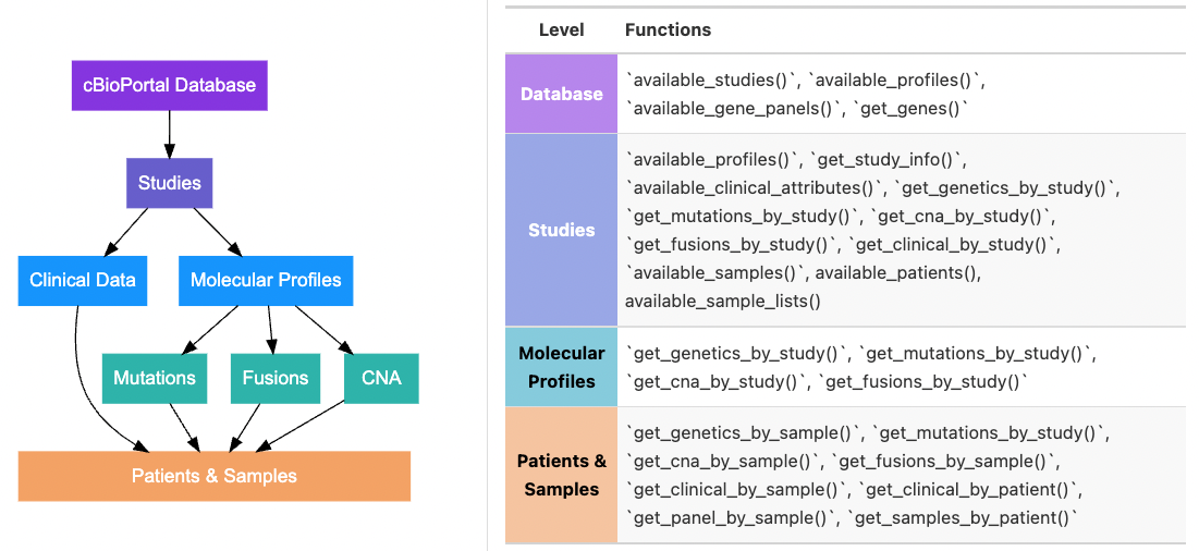 #> ✔ You are successfully connected!There are many ways to identify and pull data (e.g. by study ID, by sample ID, by molecular profile ID). Having an understanding of how data is organized in cBioPortal will help you determine which functions you need. The figure below outlines the general data schema for cBioPortal and which functions access which levels of the schema:
