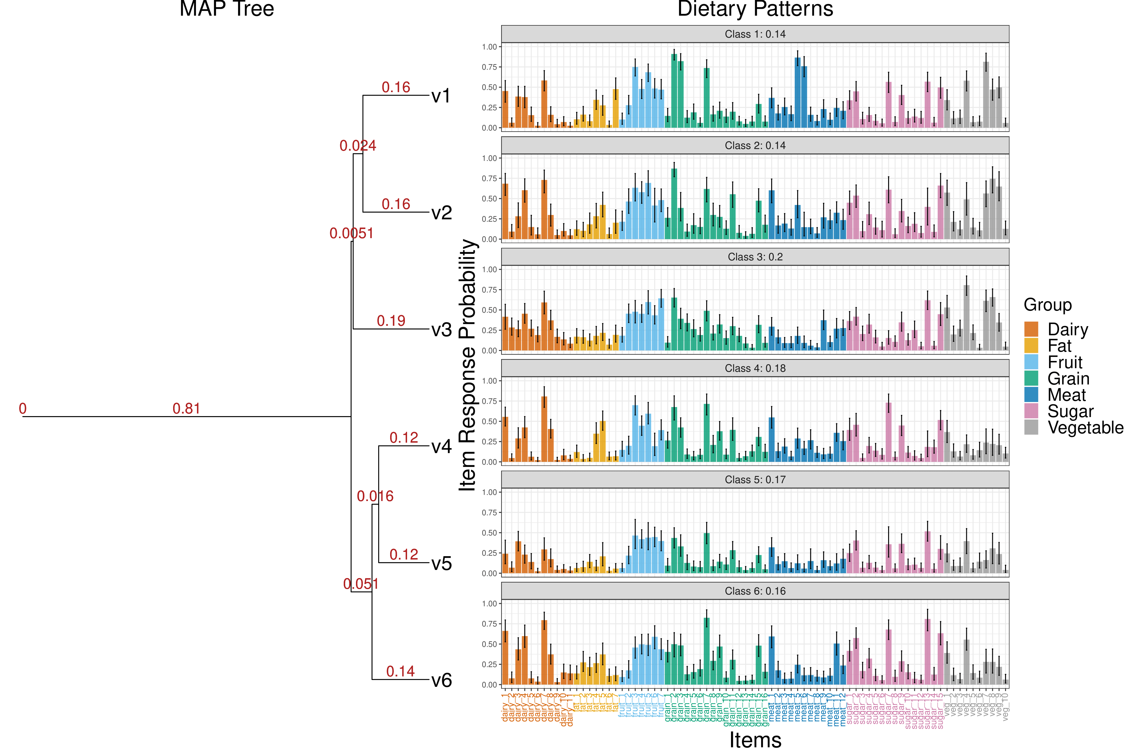 Bayesian tree-regularized LCM Li M, Stephenson B, Wu Z (2023). Tree-Regularized Bayesian Latent Class Analysis for Improving Weakly Separated Dietary Pattern Subtyping in Small-Sized Subpopulations. ArXiv:2306.04700. Link