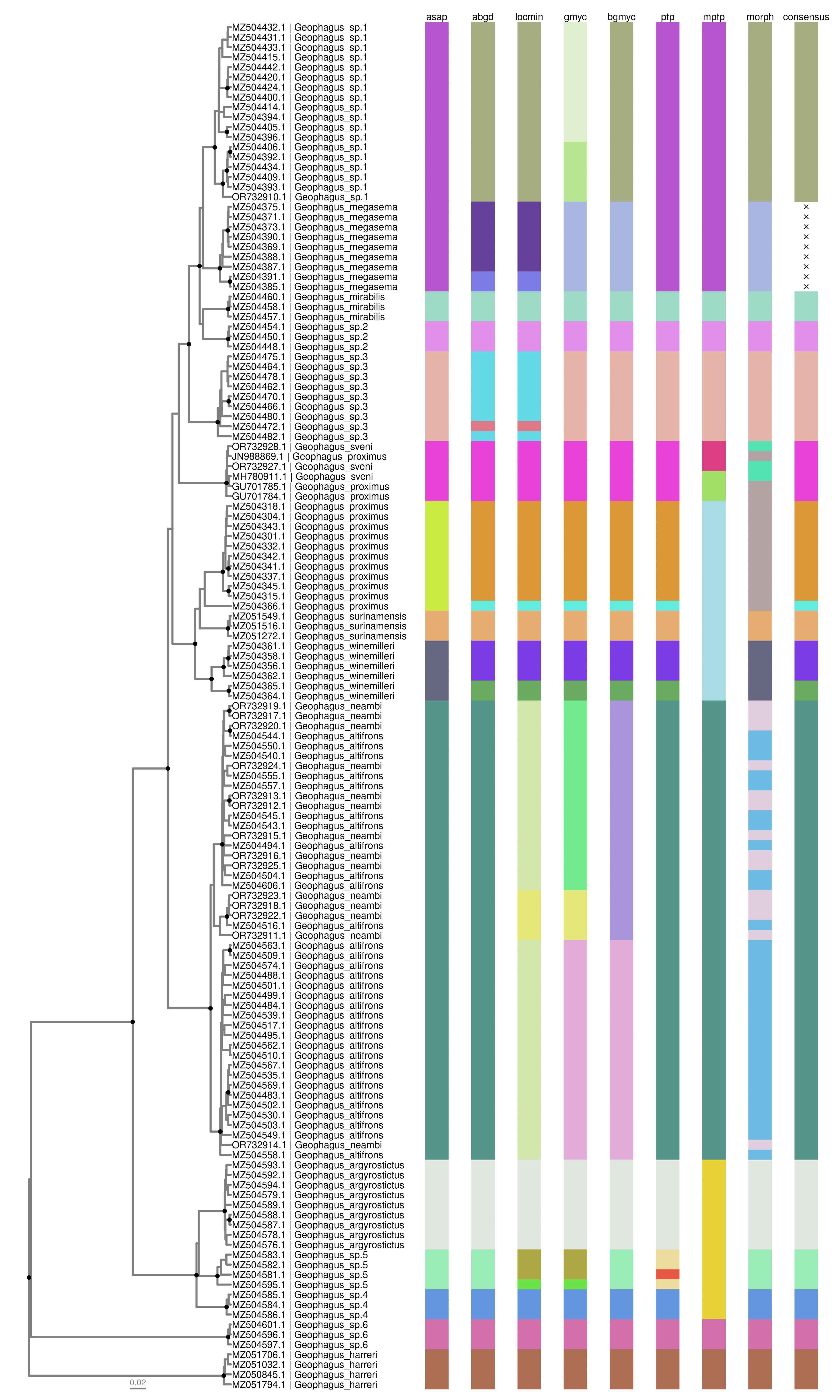 Here, we will demonstrate a single-locus species delimitation analysis on a Geophagus eartheater cichlid dataset (Ximenes et al., 2021) using a variety of methods. For full details please see the GitHub repository accompanying this R package at github.com/boopsboops/delimtools-testing.