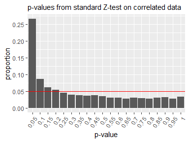 When the standard Z-test is applied to such correlated data, the resulting p-values do not follow the expected uniform distribution under the null hypothesis. As a result, smaller p-values tend to occur more frequently even when there is no true difference, increasing the risk of falsely detecting a significant difference.