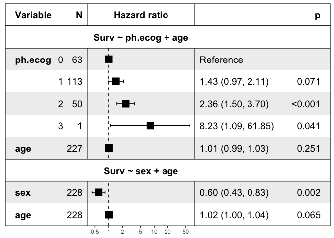 ezcox(lung, covariates = c("sex", "ph.ecog"), controls = "age")