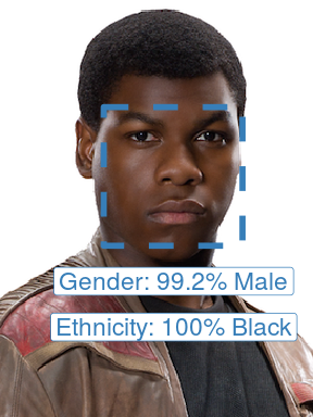 Kairos accepts image of file type JPG, PNG, or BMP. Images can be passed to several facerec functions, either as an url string or a local image prepared with prep_image(). In the following example, detect() is used to recognize the face of the Star Wars character Finn: