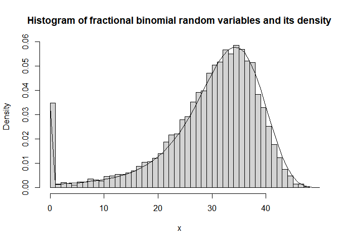 den.hist(x, breaks=51, probability = TRUE, main="Histogram of fractional binomial random variables and its density")