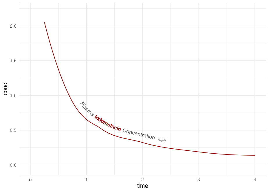You can use geom_textline and geom_labelline as a drop in for geom_line if you want it directly labelled. Just pass the label you want as an argument to geom_textline (or if you have grouped data, you can pass the label as an aesthetic mapping). As in the other geoms here, you can specify the line’s appearance and the text’s appearance separately.