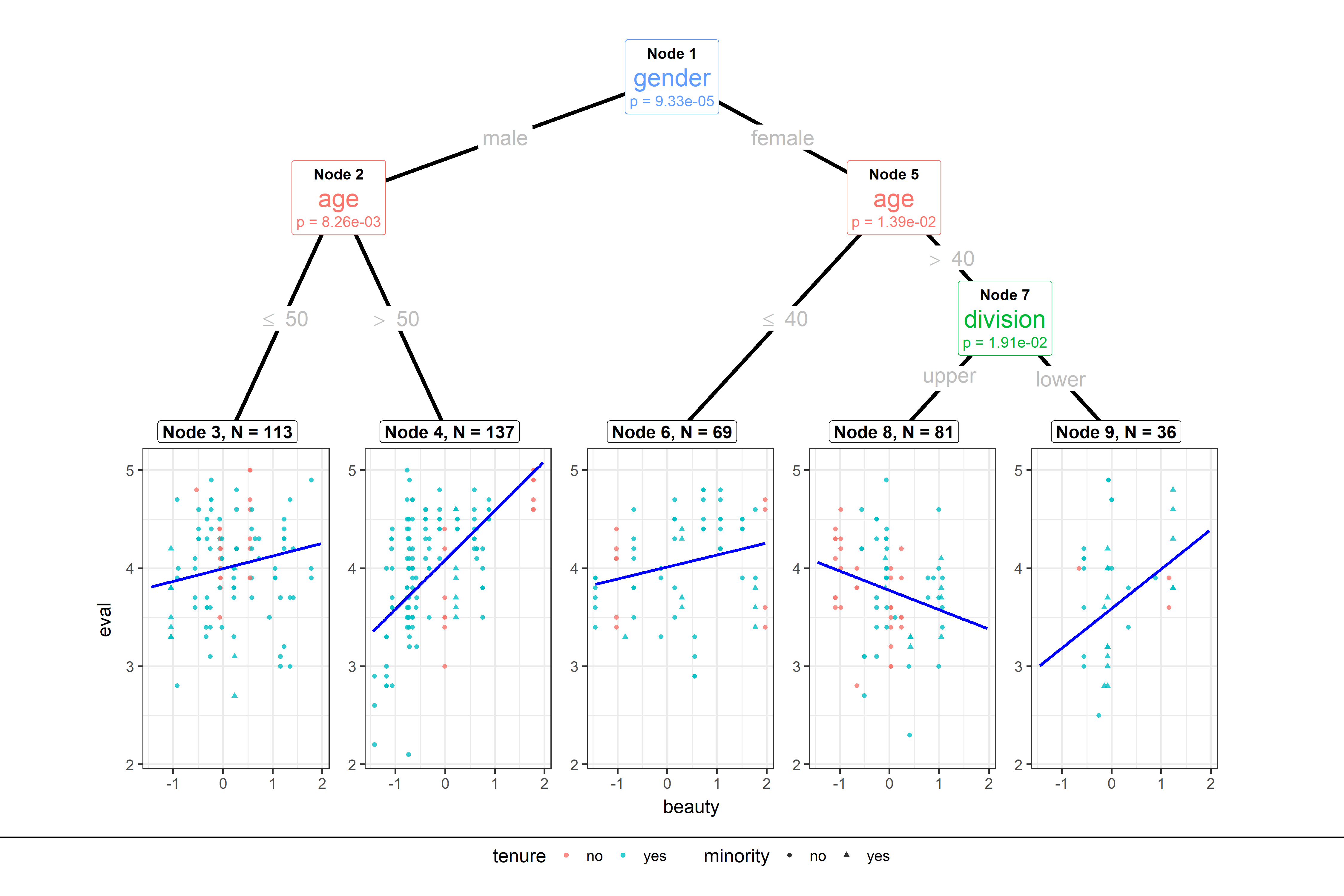 <- lmtree(eval ~ beauty | minority + age + gender + division + native +
