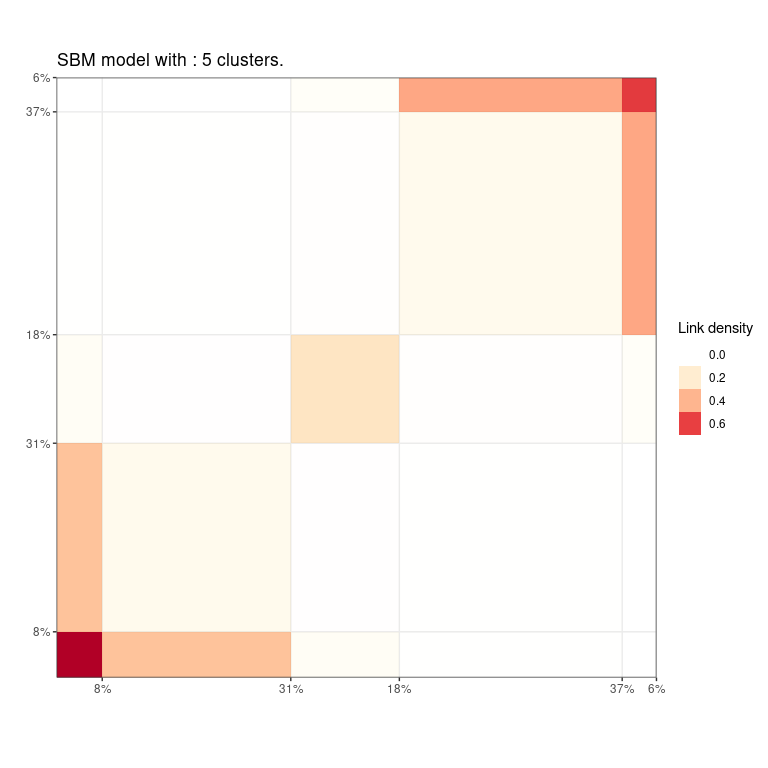 #> ── Clustering with a SBM model 5 clusters and an ICL of -1255The results of greed() is an S4 class which depends on