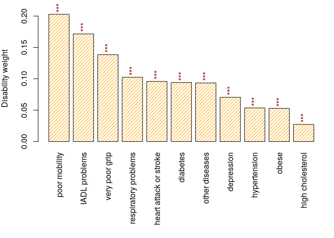 The latent health variables can be directly accessed using model1$coef.ls$latent.params. We can, however, standardize these coefficients using Jürges’ approach (Jurges 2007) in order to obtain so called disability weights. The disability weights are the same for each individual in the modeled population. The standardization is done using the standardizeCoef function.