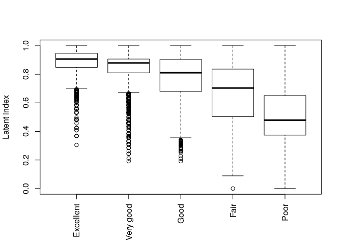 model1 contains 11 dichotomous health variables and two threshold variables. The fitted coefficient includes beta (latent.params, first 11 coefficients in the summary), lambda (thresh.lambda, threshold intercepts, “(L)” prefix in the summary), and gamma (thresh.gamma, parameters related to threshold covariates, “(G)” prefix in the summary). The model coefficients can be accessed directly by the generic coef(model1, aslist = TRUE) function, which has an option to group parameters into a list (aslist = TRUE); or simply by calling model1$coef.ls. The fitted model can be further used to analyze reporting heterogeneity.