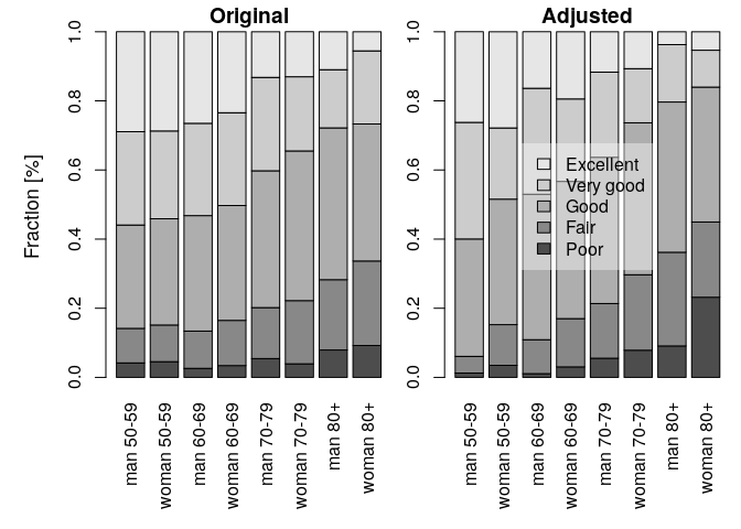 The formula describes the grouping variables. It is set to the threshold formula by default, but it can be changed. Here, the country variable is omitted, which means that the age-gender-specific frequencies are calculated for the combined countries. The results are plotted by setting the plotf = TRUE option (Fig. 4). The differences between the original and the adjusted frequencies (%) can be calculated directly using the getLevels output: