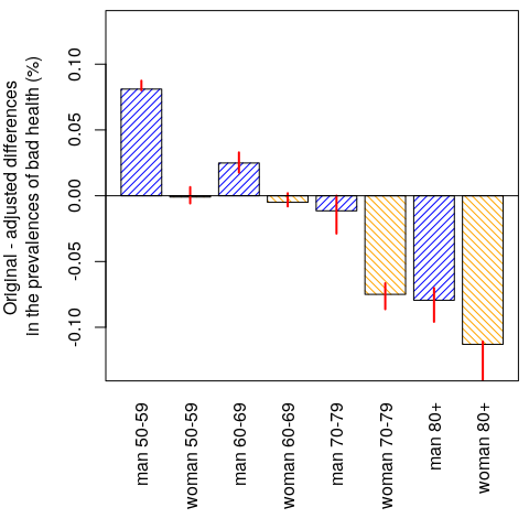 Figure 5. Difference between the original and the adjusted prevalences of bad health. The confidence intervals were calculated using the percentile bootstrap method.