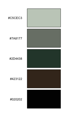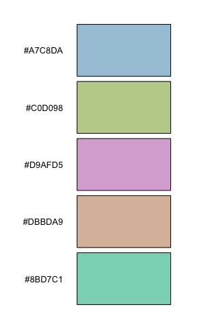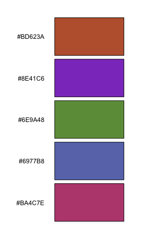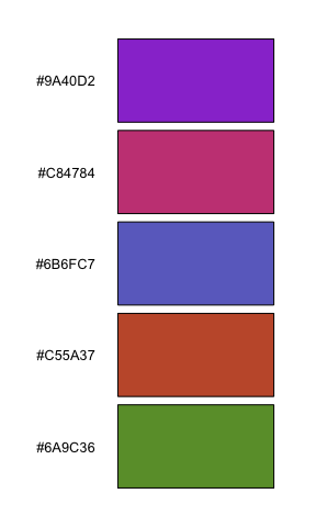 iwanthue(5, 0, 240, 0, 24, 0, 100, plot=TRUE) # shades